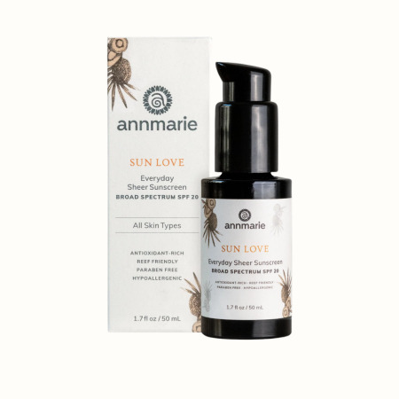 Annmarie Everyday Sheer Sunscreen SPF 20 is formulated with 15% non-nano zinc oxide for broad spectrum UVA and UVB protection. Other ingredients include organically grown skin beneficial oils like sunflower seed oil, hemp seed oil, olive oil, pumpkin seed oil, avocado oil, buriti fruit oil, beeswax, and lavender oil. The sunscreen has an oily structure and leaves no white cast. You can use it for face and body. For more information, visit my Best Non-Toxic Face Sunscreen Guide.