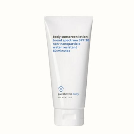 Pure Haven Body Sunscreen Lotion SPF 30 uses 20% reef-safe non-nano zinc oxide as an active ingredient for UVA and UVB protection. It has no fragrance or dyes and is water resistant for up to 80 minutes. My husband uses it and loves it! Shop now with the PURE15 code for 15% off. For more information, read below.